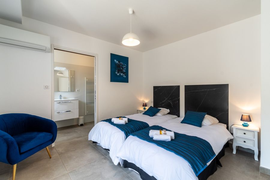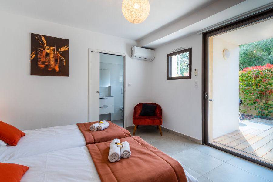 Les villas sont dotées de quatre couchages fixes, mais elles peuvent accueillir sans mal une personne supplémentaire. Nous rajouterons dans ce cas un lit pliant de 90x200 ainsi que la literie et le linge de toilette correspondants. Cela n'entraînera aucun frais supplémentaire.