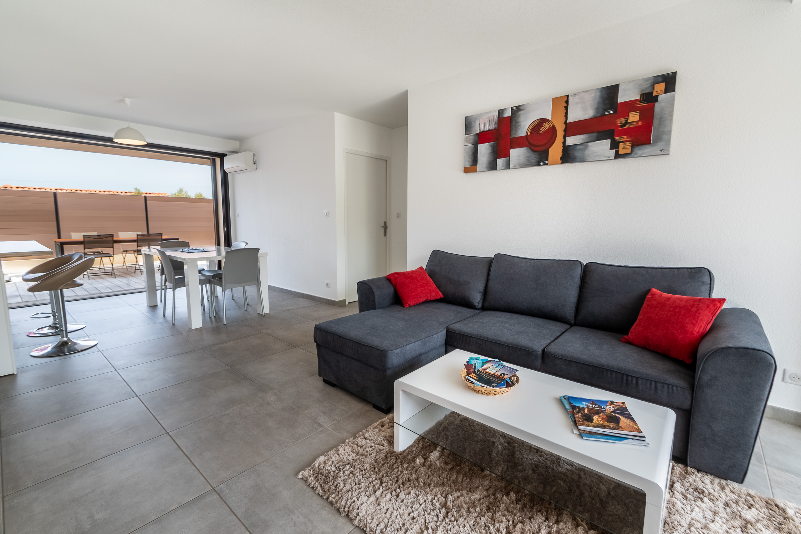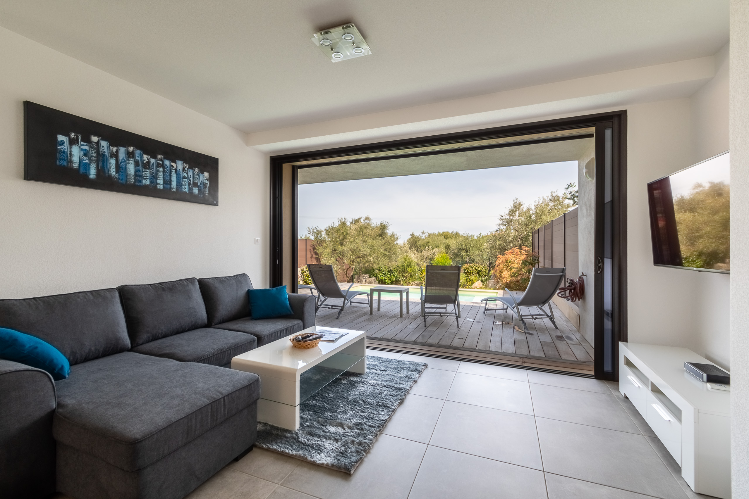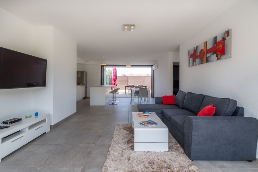 Un vaste séjour ouvert sur la terrasse avec canapé d'angle 4 places, table basse, télévision de 127cm fixée au mur disposant de plusieurs ports hdmi et proposant, outre la TNT, le catalogue par satellite Astra (avec notamment de nombreuses chaînes étrangères), meuble tv,lecteur dvd/blu-ray...