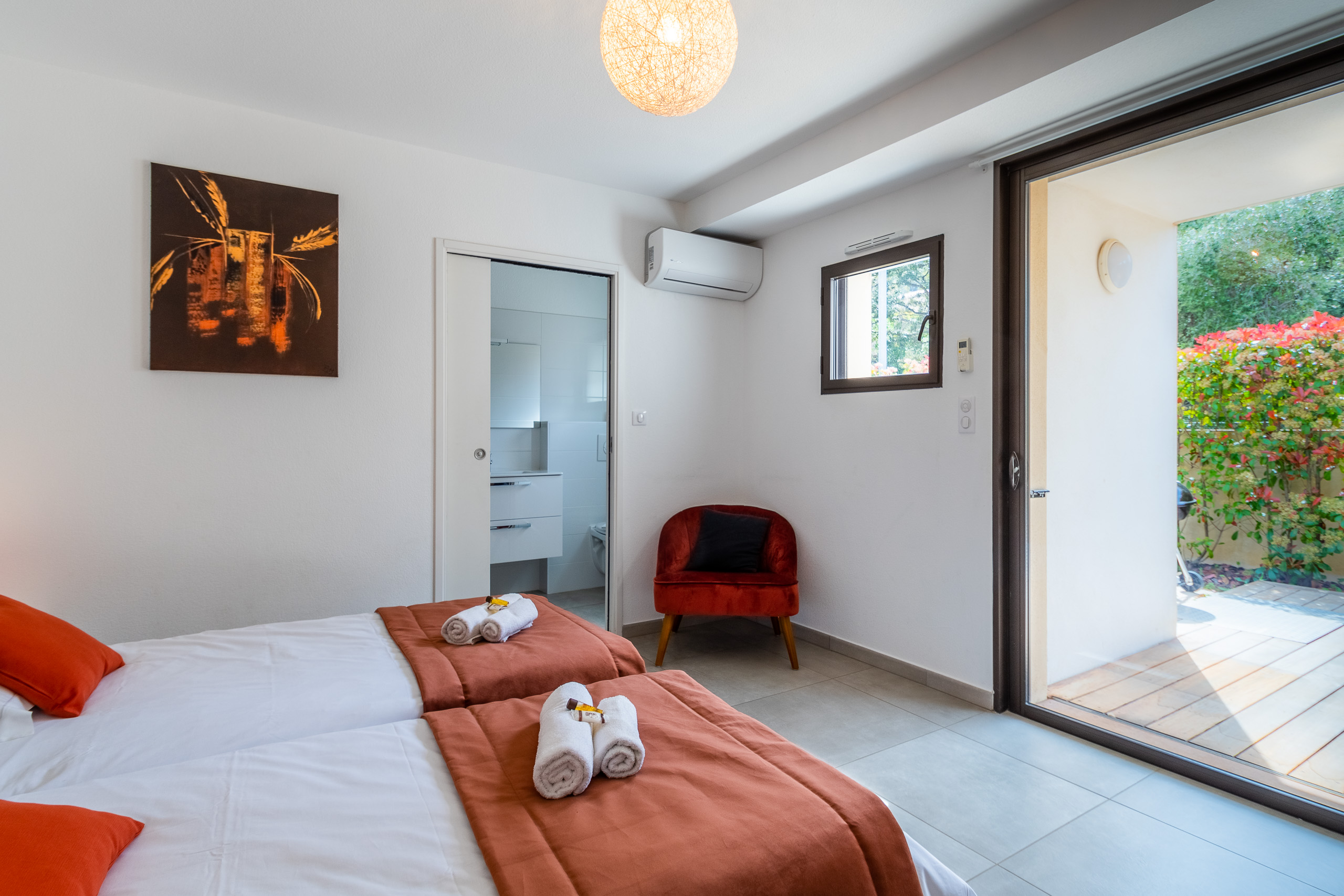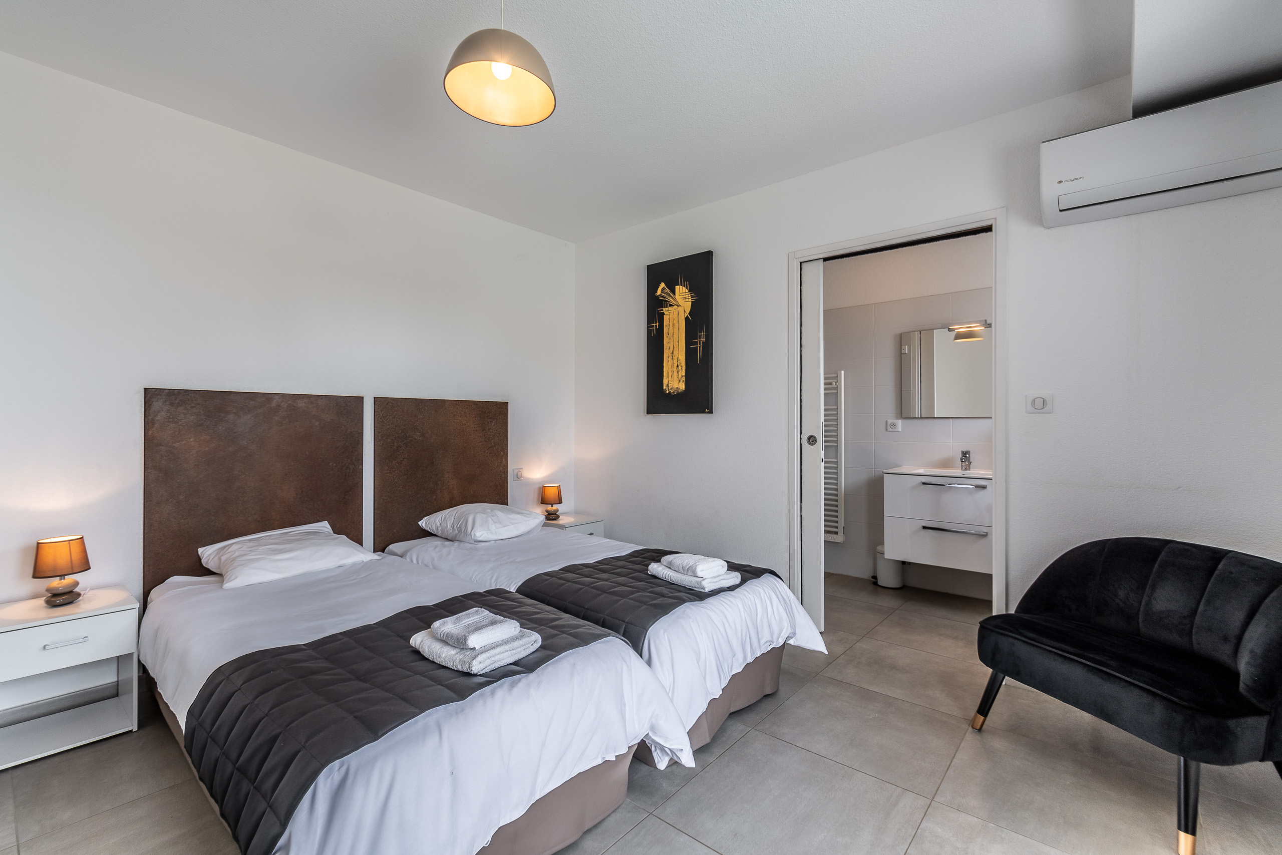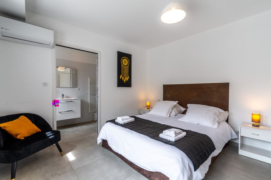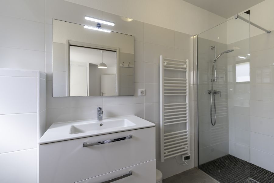 2 salles des bains, une attenante à chaque chambre pour offrir à nos hôtes une intimité absolue et une autonomie parfaite. Vaste douche à l'italienne, WC suspendus, vasque avec meuble de rangement, sèche-serviettes...