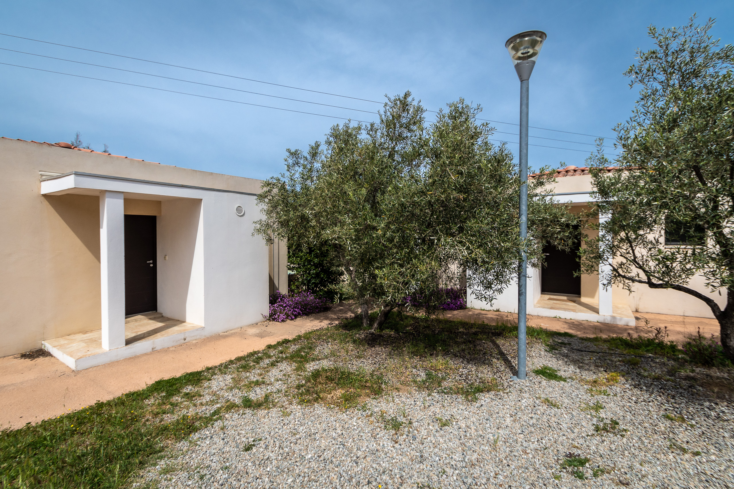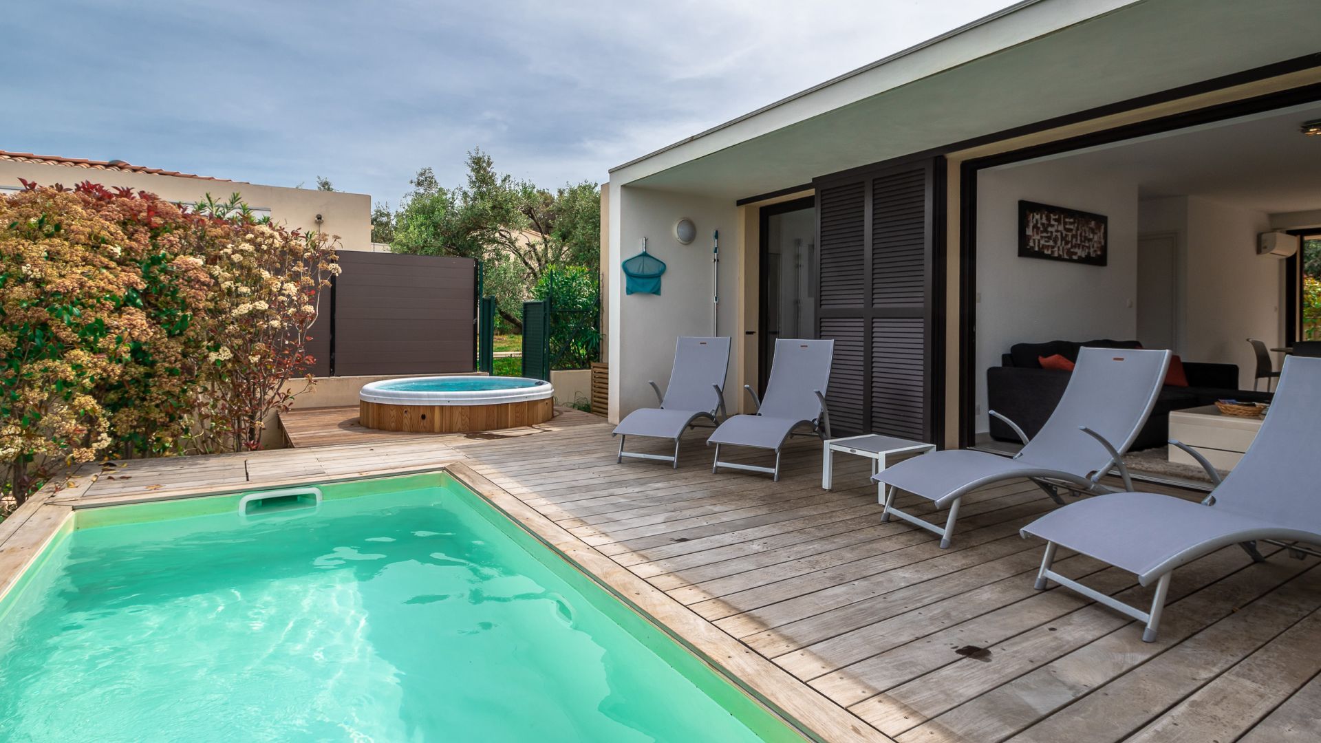 ⁎ L'autre dévolue à la baignade, avec la piscine et le spa (cinq transats par maison).Des jardins privatifs semés d'essences variées.