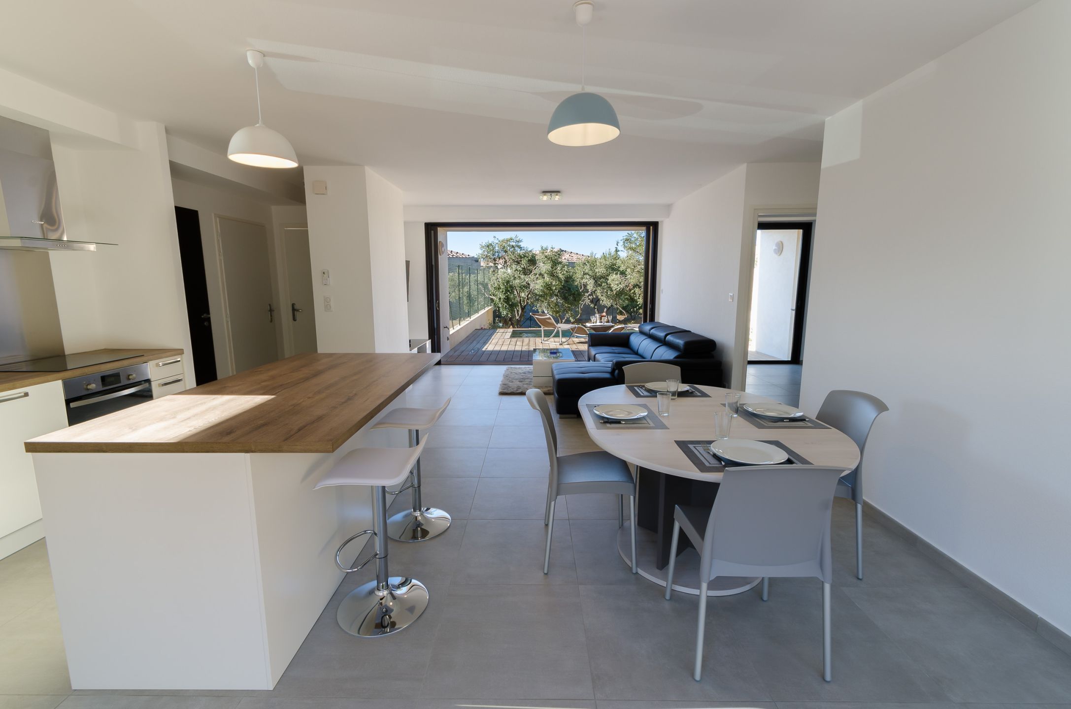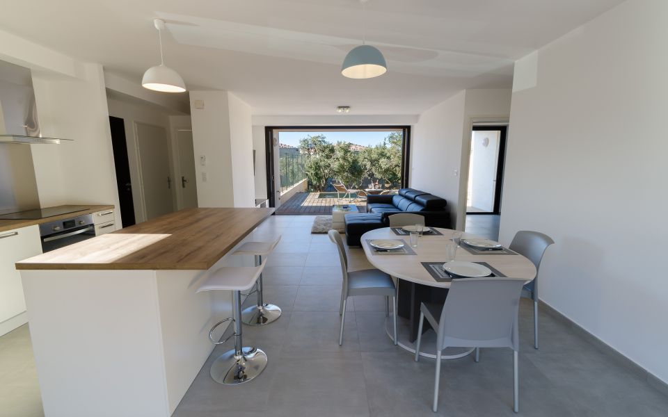 Une cuisine américaine entièrement équipée : réfrigérateur, congélateur, four, four à micro-onde, plaques de cuisson, lave-vaisselle, machine à capsules et cafetière à filtre, bouilloire, grille-pain, plancha électrique. Un îlot de cuisine avec deux tabourets pivotants (sauf pour villa PMR). Une table à manger avec plusieurs chaises.
